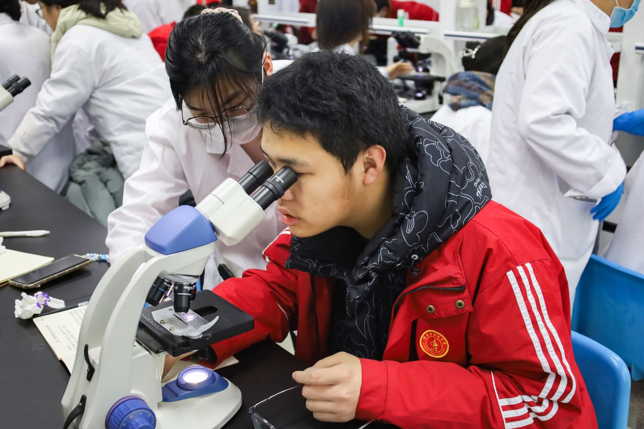 取材、解离、漂洗……从制作标本到观察细胞形态,在8858cc永利官网教师江转转和“小老师”的带领下,高中学生们亲身参与有丝分裂显微观察实验,将课本知识运用于实践操作。