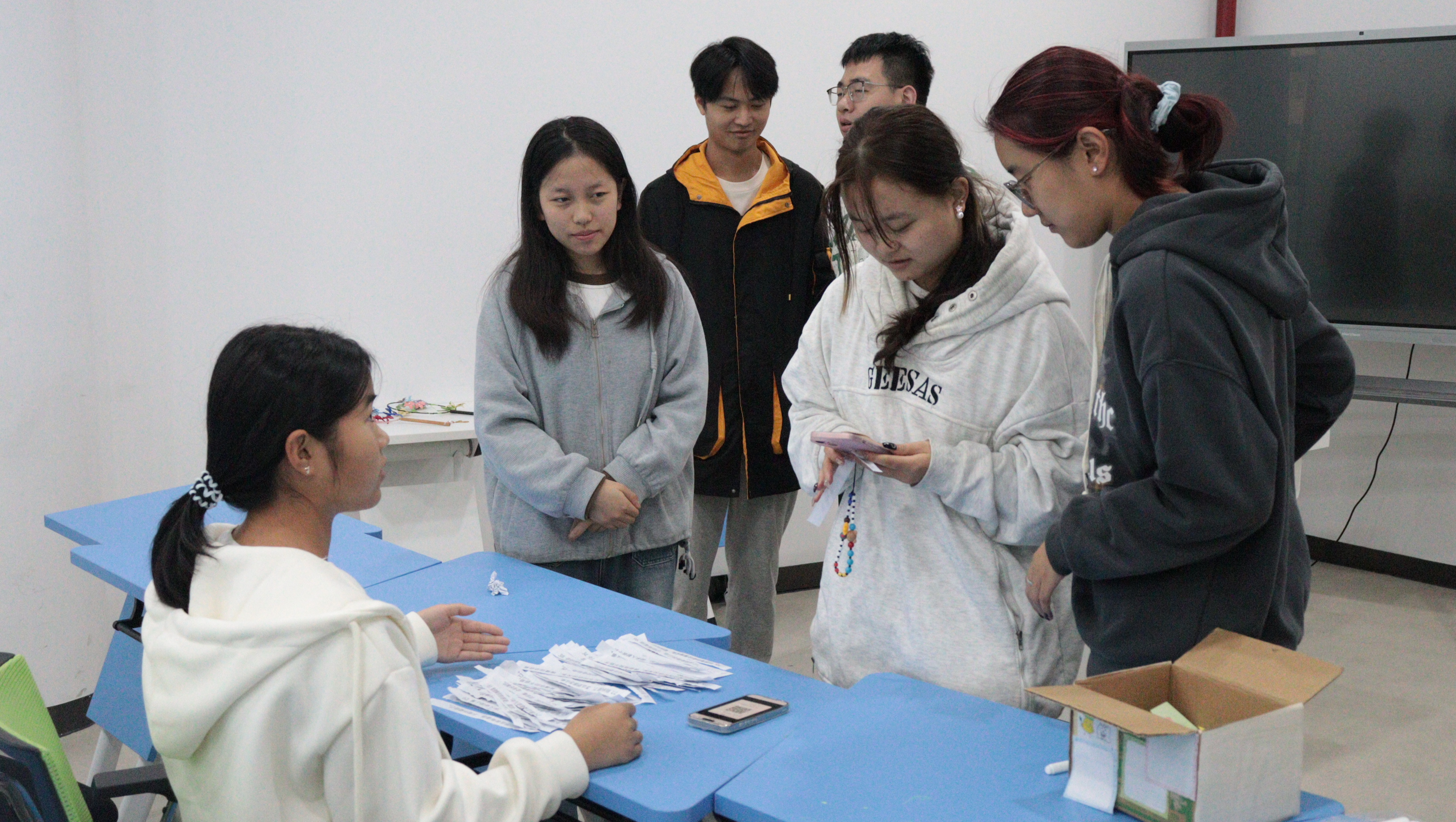 投掷环节结束后,同学们将在学长学姐那里抽取写有暖心话语的纸条,“你已经很棒啦,慢一点也没关系”“烦恼会像纸飞机落地,而你会一直向前”这一段段满含温度的话语,无不使得美育活动室的暖意如潺潺溪流般悠悠流转,在每位参加活动的同学心间荡开温柔的涟漪。
