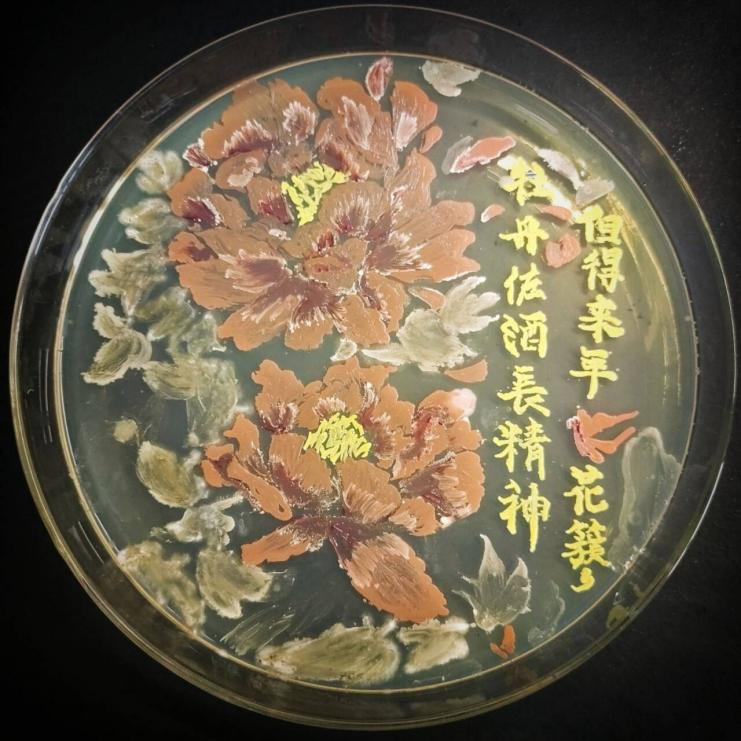 作为本次获奖的亮点作品,《牡丹佐酒长精神》巧妙将微生物实验与艺术创作、传统文化深度融合。作品以“牡丹”为视觉核心,借红酵母、白酵母勾勒花瓣的层次与温润,用青霉点缀叶片的生机,凭粘质沙雷氏菌与金黄色葡萄球菌增添色彩的丰富度,让斑斓菌落在培养基上绽放出牡丹的华贵姿态,更隐现“酒文化”的醇厚意境 —— 微观的生命形态与宏观的文化符号碰撞,既展现了微生物世界的奇妙活力,也传递出传统美学的精神滋养。